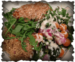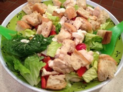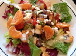 I'm always looking for new twists on a green salad and was inspired by Cooking Light's "Easy Pasta Salad Recipes for 250 Calories" column in the June issue. It features some real neat combinations that I thought lent themselves just as easily to any kind of salad - tossed over greens or mixed with a grain such as bulgar, barley or farro. Cherry-Almond Crunch was the combo I chose: ¾ cup pitted halved fresh cherries + ¼ cup thinly sliced toasted almonds + 2 tablespoons chopped fresh basil + 1.5 ounces crumbled goat cheese. I happened to have some cooked tri-color quinoa on hand and thought that would be a nice addition, so I mixed all these ingredients together in a separate bowl and then gently tossed them over a combination of some mixed baby greens with herbs and Mizuna lettuce - a interesting locally grown green I picked up at Whole Foods. It reminded me of arugula - with the same deep green, long, thin and spiky leaves. I did a little research on it and discovered it is a cool season Japanese mustard green often used in salads but can also be incorporated into stir-fries and other cooked dishes. For a dressing I mixed together some vanilla yogurt, mustard and lemon juice, then thinned it out with a little water. The end result was delicious!